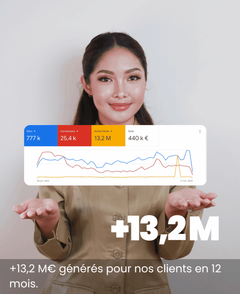 Expertise prouvée et résultats mesurables – Nos clients constatent en moyenne un ROI de 3x sur leur investissement digital, +540k impressions générées, +87% de taux de conversion amélioré, et une croissance digitale multipliée par 5. Ces chiffres ne sont pas du marketing – ce sont les résultats concrets d’une agence web qui comprend les enjeux business.
